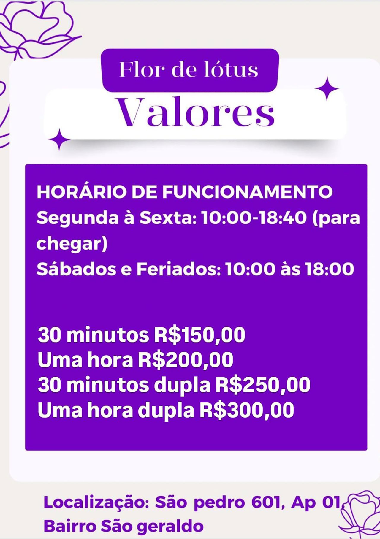 30 minutos: R$ 150,00, 1 hora: R$ 200,00, 30 minutos dupla: R$ 250,00, 1 hora dupla: R$ 300,00.